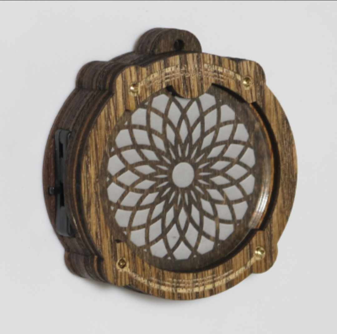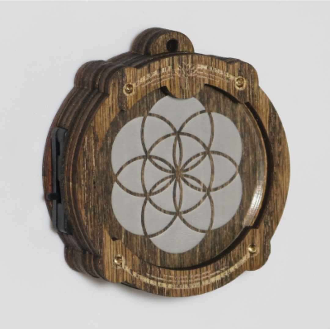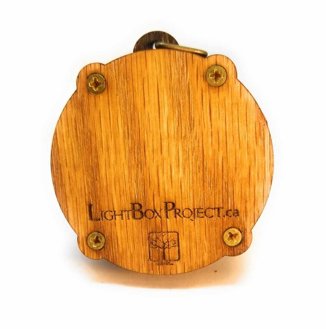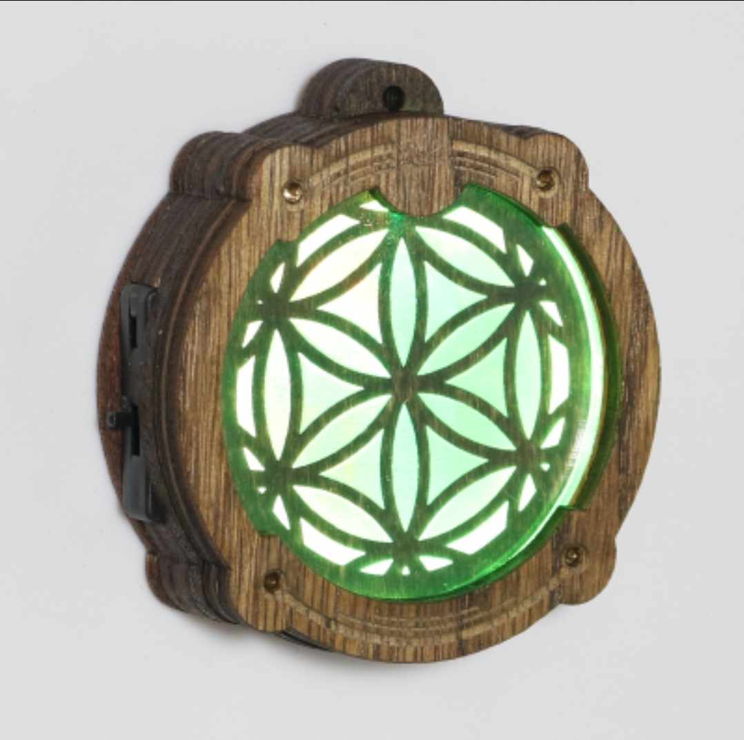 Mesmerize others and celebrate the beauty in organized chaos with this gorgeous Amulight. Makes a great accessory for any person, any place! All Amulights are approx. 2.3” diameter and 3/4” thick, and are made from layered, sustainably-sourced oak assembled with custom-developed electrical and LED components. Amulights automatically cycle through a full rainbow of colors indefinitely until you turn them off. With an on/off switch and replaceable watch batteries, Amulights will keep you in the glow for years to come. Your Amulight will come with a synthetic black cord – use it for wear as a necklace, or replace the cord with another clip of your choosing using the small hole at the top of the Amulight Projector.