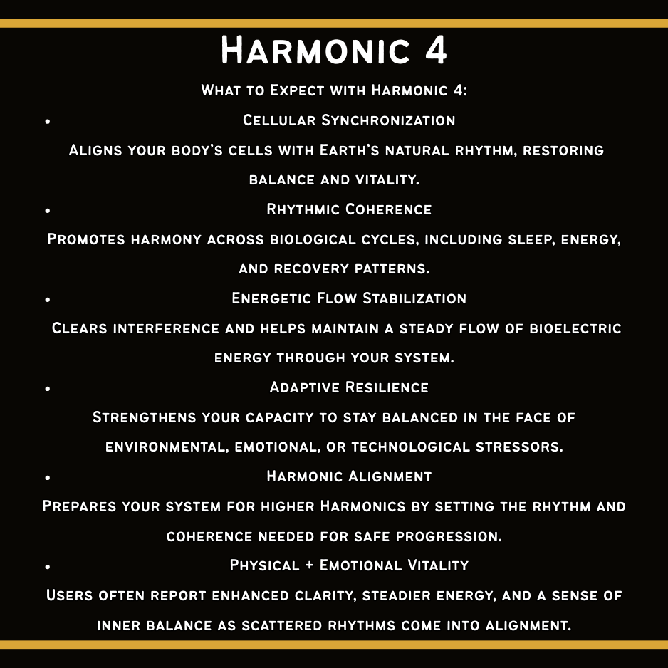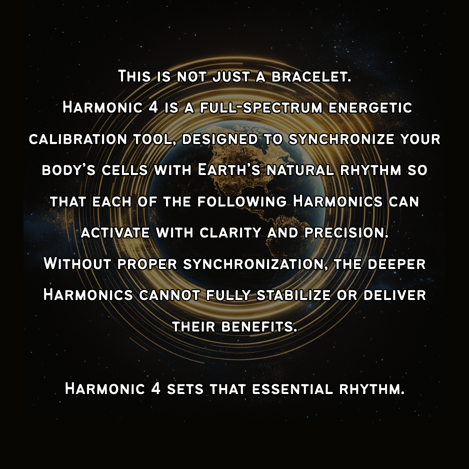 Each band is imprinted to carry both the Harmonic 4 Frequency and the foundational 7.83 Hz grounding imprint, ensuring continuous stability while activating higher resonance. As the first step in the Harmonic Path, the 4th Harmonic provides the essential synchronization needed for the deeper Harmonics to fully integrate.