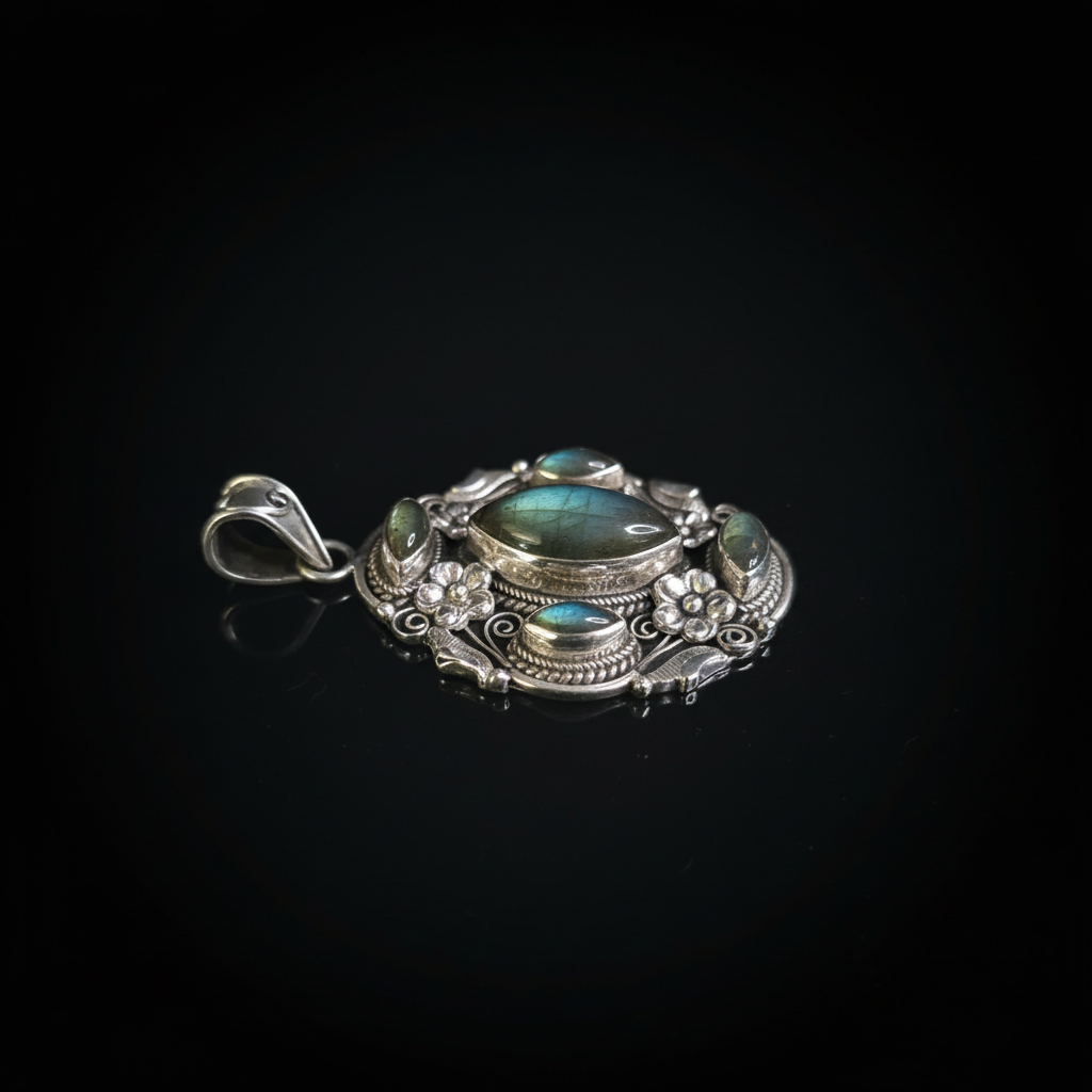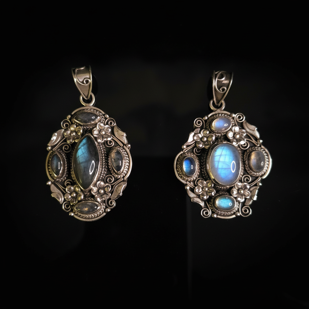 Set with natural Labradorite cabochons