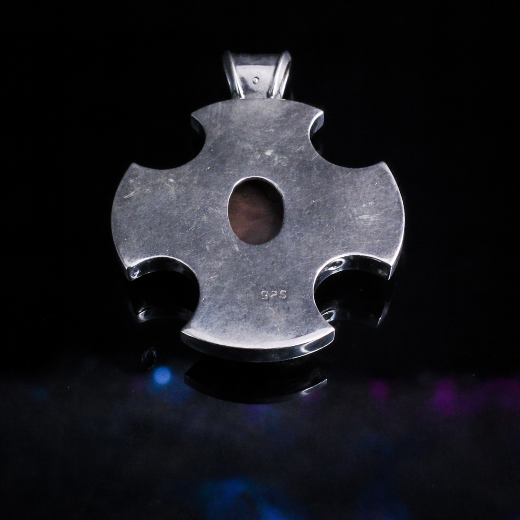 Cool-toned sterling silver shaped as a cross-gate of balance and direction.